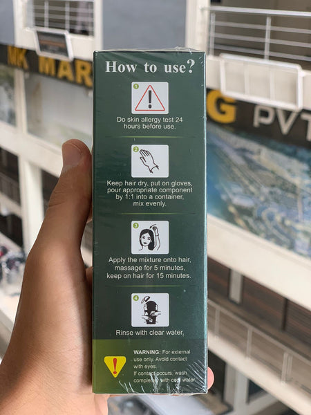 2 Keep hair dry, put on gloves, pour appropnate component by 1:1 into a container mix evenly.